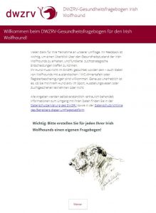 unten finden Sie den Link zu unserem neuen Gesundheits-Fragebogen. Ihr Feedback ist wichtig, um einen Überblick über den Gesundheitszustand unserer Wofhounds zu erhalten, und wird neben anderen Datenquellen Eingang in die rassespezifische DWZRV-Zuchtstrategie für Irish Wolfhounds haben.