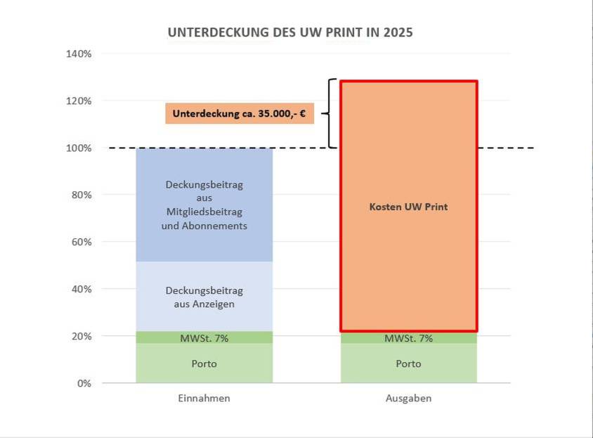 Vergleich der Einnahmen mit den Ausgaben für einen UW in Papierform. Die Einnahmen stammen aus Mitgliedsbeiträgen und Abonnements sowie Anzeigen. Nur diese stehen für die Produktion des UW zur Verfügung. Den Einnahmen für Porto und MWSt stehen Ausgaben in gleicher Höhe entgegen.