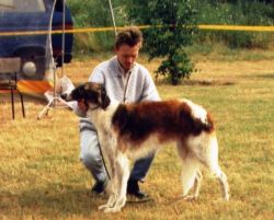 Sie selbst mochte keine, wie sie es nannte, bunten Barsois, die mehrfarbig gezeichnet waren. Angela Krüpe wollte nie eine Farbvermischung in ihrer Zucht, ich habe sie so verstanden das sie es hielt wie die Perchino Zucht, Farbe klar und reingehalten. Sie hat soweit mir bekannt da auch nie Kompromisse gemacht.